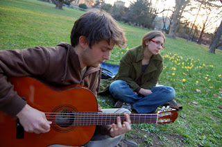 "Avastasin" üsna ühikate lähedalt ilusa suure pargi, kus mõnus jooksmas käia ning paaril korral oleme Aude ja poistega seal ka pilli mänginud. Või no kui aus olla, siis nemad rohkem mängivad, sest mina ei suuda nendega veel kaasa tinistada. Ma olen omadega ikka nii noodis kinni, et ei oska peast midagi improviseerida, aga ma harjutan praegu paari lugu, sest tore oleks ka kaasa lüüa. Ühele meloodiatest kirjutasid Sebastien ja Stephan prantsusekeelse mõistujutu stiilis teksti, kus kapsas ja kajakas dialoogi peavad. Mina laulan kajaka osa:) Pean refrääni jaoks ka eestikeelse teksti välja mõtlema, nii et siis kõlaksid kaks keelt korraga.